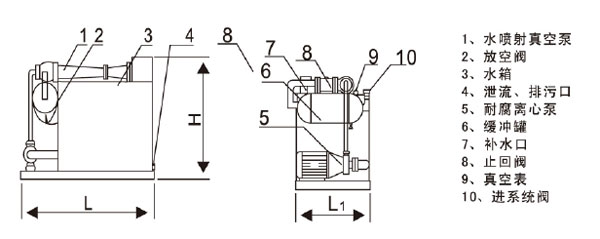 1、蒸汽真空泵 2、水噴射真空閥 3、放空閥 4、水箱 5、泄流、排污口 6、耐腐離心泵 7、緩沖罐 8、補水口 9、系統連接閥